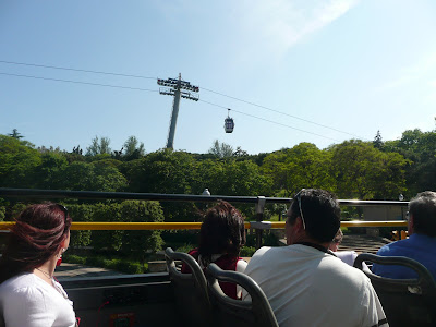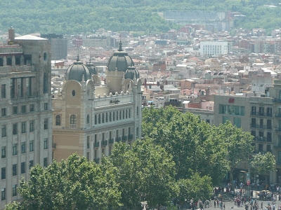 | Ao longe, a cabine do teleférico que liga a cidade a Montjuic, o ponto mais elevado de Barcelona |