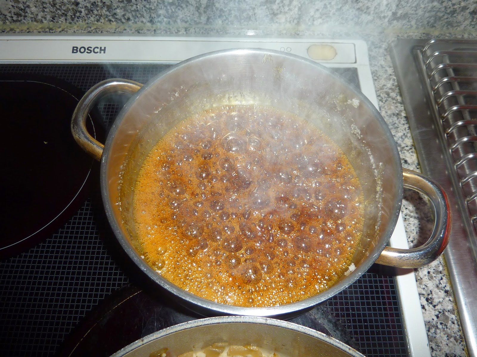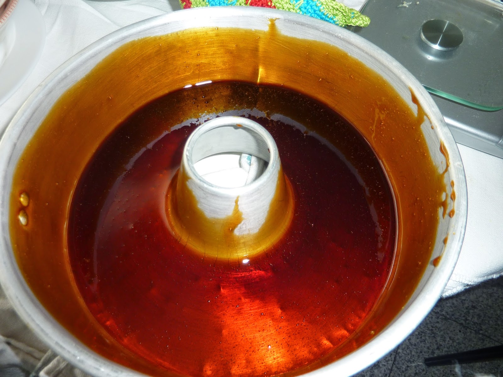 | Preparei o caramelo com 200 g de açúcar e 1 colher de chá de água, que ferveram até ser atingida esta bela cor. |