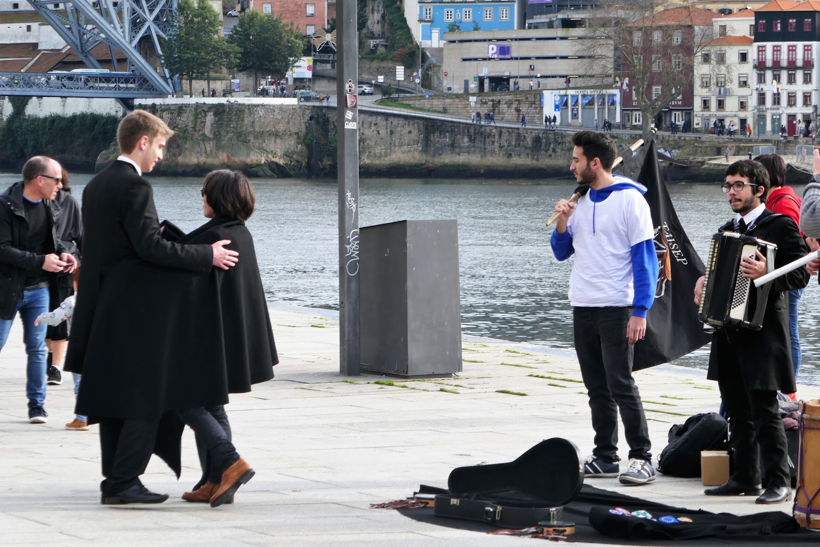 | Encontrei a Tuna! Não sei de que Faculdade, mas lá estavam eles, os jovens estudantes animados. Tocavam, cantavam e até dançavam. |