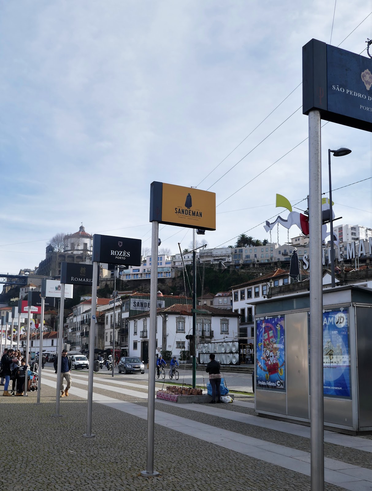 | Em terra, placas com a identificação das diferentes Caves, das diferentes marcas de vinho |