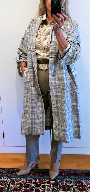 A prová-lo, este conjunto, que somados os anos atingiria as dezenas - a blusa e as calças têm mais de 10 , a gabardina é do ano passado e só os sapatos são novos, mas, atendendo à sua cor neutra e estilo clássico e confortável, presumo que ficaremos juntos e felizes por muito tempo.