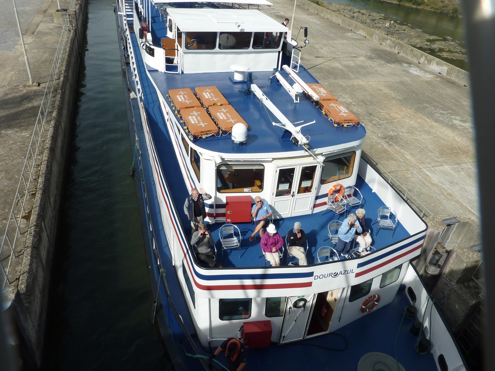 Encontrei um imenso barco de cruzeiros que, numa eclusa, esperava para prosseguir viagem: