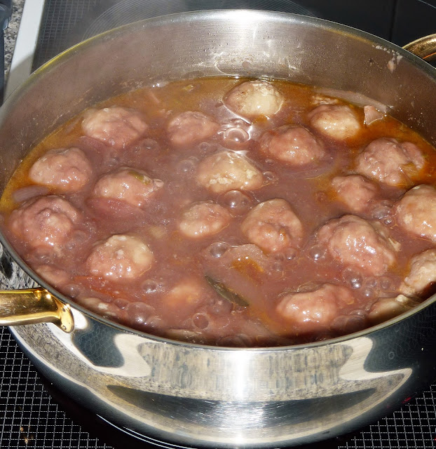 Despeja-se o caldo de carne e o vinho e logo que levanta fervura, juntam-se as almôndegas;