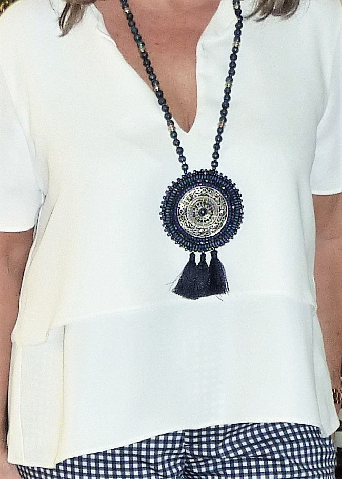 | ...blusa branca com colar azul ... |