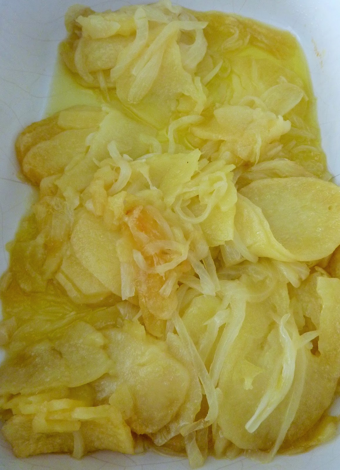 Cortadas as batatas, a cebola e 2 dentes de alho, regando a mistura com azeite, tapei o recipiente e deixei que cozesse por períodos de 5 minutos, findos os quais, retirava do forno, misturava os ingredientes e repunha para continuar a operação.